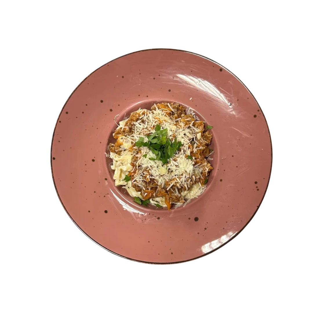 Freshly cooked pasta mixed with cream, topped with rich Bolognese sauce, and served with grated Parmesan and parsley.