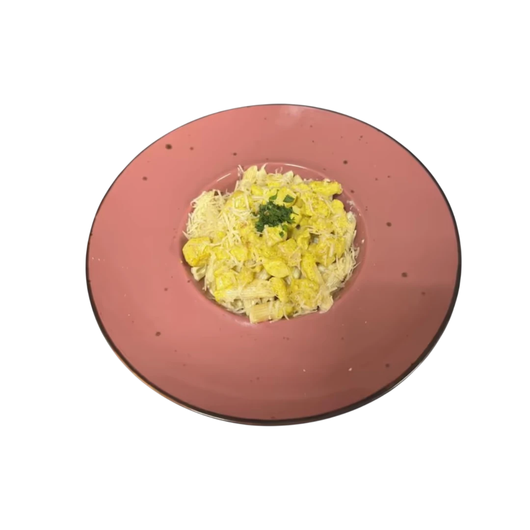 Italian penne pasta in a creamy curry sauce with chicken, cheese, and a golden touch of spice. A perfect fusion of Italian comfort and exotic flavor.